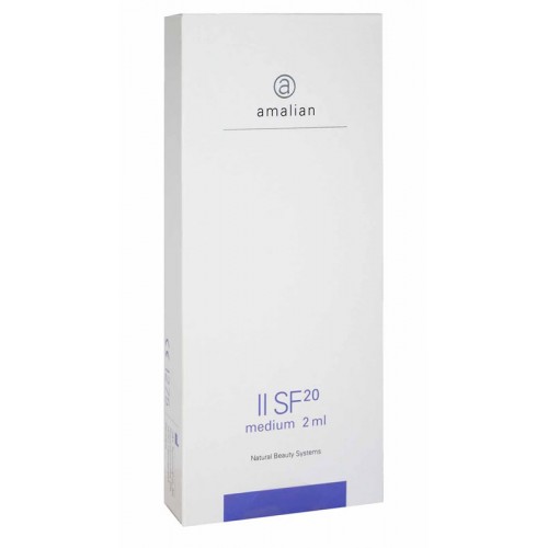 Amalian II (SF20) 2 мл - высокогомогенизированный, повышенной степени очистки филлер с концентрацией ГК неживотного происхождения 20мг/мл, для коррекции носогубных и губоподбородочных складок, а также для проведения процедур объёмно-контурного моделирования губ.